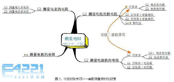 在探究式课堂教学中,学生以小组为单位进行讨论是非常普遍开展的一种学习方式,然而也同样会出现我们前面所说的讨论中出现的问题,在讨论式教学中教学效率不高的现象是普遍存在的,要改变这种情况,只有将学生的注意力全部集中到讨论的中心话题上来,这正是思维导图解决的问题,同时利用适合的软件,还可以及时记录下讨论结果,体现集体思维的成果。在教学中,我们一般是首先筛选探究的问题,有些问题值得讨论,有些讨论的价值不高,在这方面要发挥教师的主导作用,课前进行筛选。在课堂上,学生分小组学习,每个小组至少一台计算机,一个学生作为小组的书记员,记录大家的讨论结果,因为考虑到mindmanager十分便于快速记录,所以我们在这样的课上多使用这个软件。图7就是高三学生在进行"测量电阻"专题复习时一个小组的课堂讨论记录。