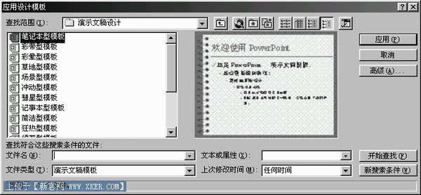 单击"格式"菜单中的"应用设计模板…"命令,选择合适的模板,也可在幻灯片上单击右键,通过快捷菜单选择"应用设计模板…"命令。