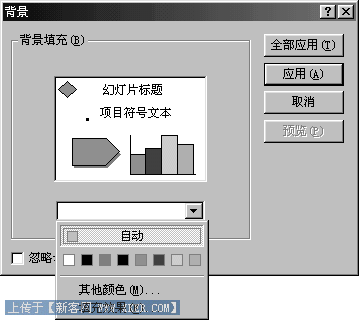 单击"格式"菜单中的"背景"命令,在"背景"对话框中,打开下拉列表框,或单击"其他颜色…"选择合适的颜色,也可以选择"填充效果"。