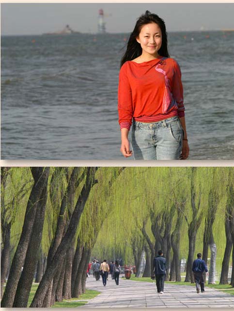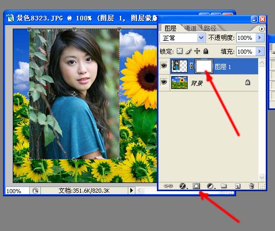 先来认识一下它,先建一个看看:为了看出效果,我们打开一个风景和一个MM,MM在上,风景在下,给MM层添加一个蒙版: