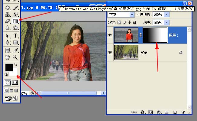 对人物层添加蒙版,拉出黑白渐变,黑色部分隐藏,白色部分显示,灰色部分过度,关键是用渐变后过度非常自然,这是我们用手涂抹弄不出来的效果。
