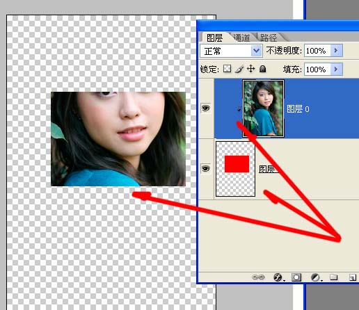 我们来实际操作一下: 还用这个MM,在MM层下层填充一个小一些的方形,在两个图层间按着Alt键点击,就对MM层创建了剪切蒙版,当然也可以在菜单里建。看看效果,再拖动一下方块层,再看看效果。