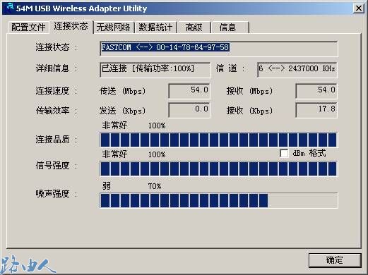 (3)配置完成,连续点击两次确定回到客户端应用程序主界面,我们可以看到网卡和无线路由器已经建立了连接