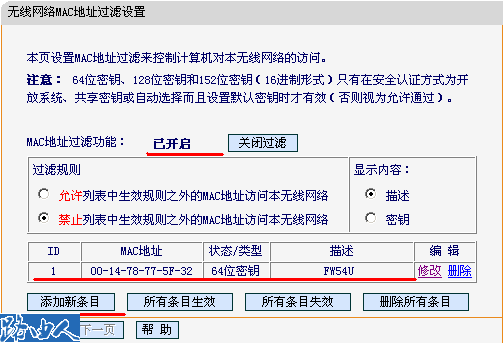 打开无线设置->MAC地址过滤,在MAC地址过滤页面添加新条目,进入参数界面