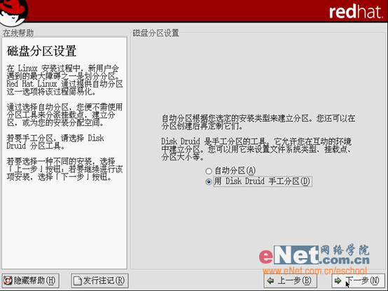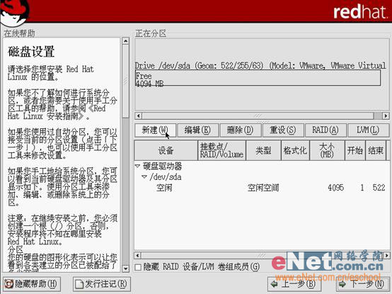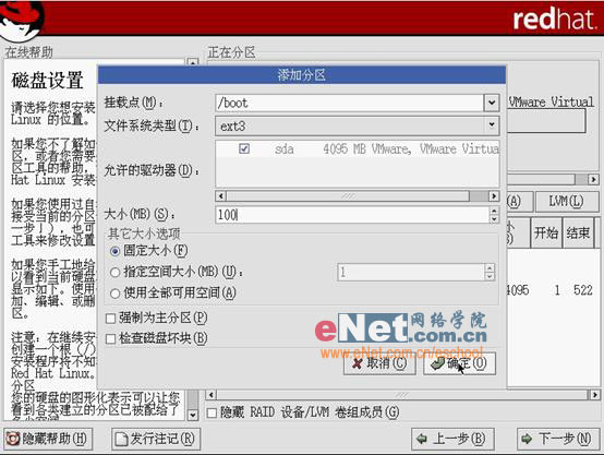 第七步:磁盘分区设置。其中包括两个选项, “自动”和“手动”。自动分区会将所有的整个硬盘按照容量大小平均分区格式化,适合没有装任何资料的新电脑,但如果你在这之前装有其他系统,或是其他分区中存在的数据的话,建议您还是“手动分区”,这样不会丢失您原来的文件数据。 ![]() 第八步:新建分区。在图形界面下比较直观,一般都会显示出你硬盘的容量,厂商等相关信息。直接点击“新建”来创建新的分区。 ![]() 第九步:创建完新的分区之后,需要添加一个/boot分区(类似Windows的引导分区),类型为ext3,单击“确定”。 ![]() |