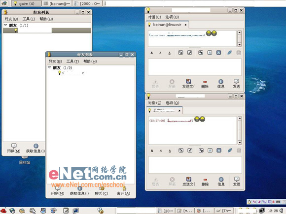 加入名单中的好友,只要上线,就可以立即在Gaim-好友列表的上线也面中看到。点击在线的好友头像便弹出聊天对话框,其中包括了字体大小,字体颜色及类型,少量的表情等。在对话框中敲入语句后点击发送按钮或按Enter键就可以完成消息的发送过程了。