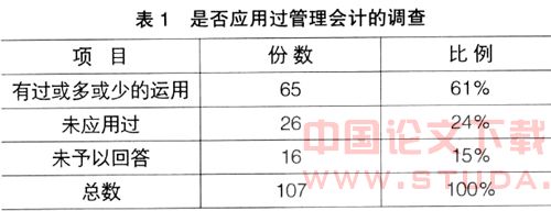 综上所述,目前我国对企业管理会计模式有一定的研究成果,但多局限于理论研究,实践性差,没有针对我国中小企业的特点构建相应的管理会计模式。侯齐敏曾对我国中小企业做过一项是否应用过管理会计和管理会计应用现状的问卷调查,结果如表1和表2所示: