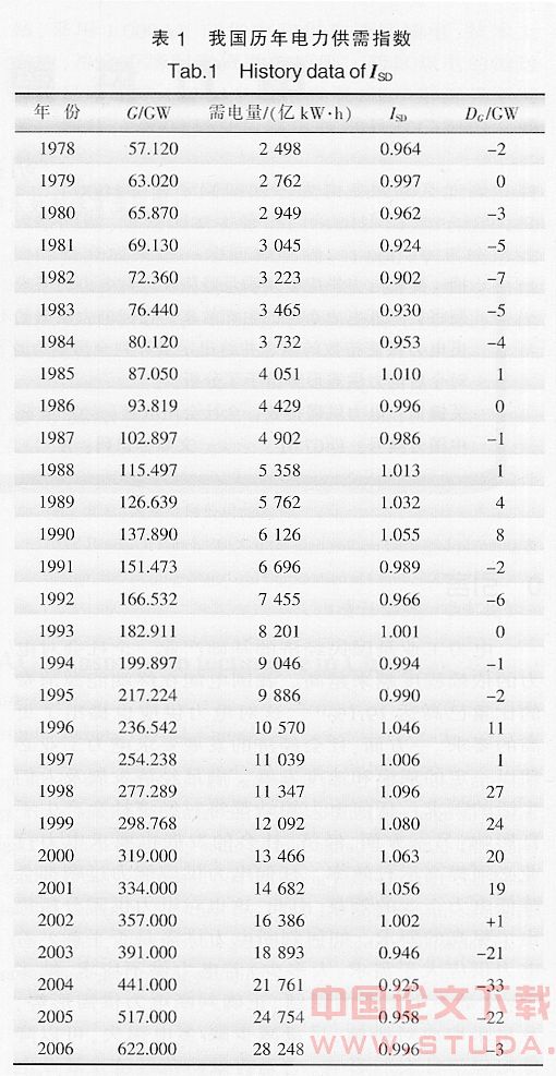 表1所示:1979年我国电力装机63.020GW,全社会用电量2762亿kW·h,电力供需指数为0.997,处于黄色区域,电力缺口0.3%。电力供需基本平衡;1985年我国电力装机87.050GW,全社会用电量4051亿kW·h,电力供需指数为1.010,处于绿色区域,电力供需基本平衡;1992年我国电力装机166.532GW,全社会用电量 7455亿kW·h,电力供需指数为0.966,处于红色区域,电力缺口3.4%,缺少发电装机6GW;1998年我国电力装机277.289GW,全社会用电量11347亿kW·h,电力供需指数为1.096,处于红色区域,电力盈余9.6%,发电装机盈余27GW;2003年我国电力装机 391.000GW。全社会用电量18893亿kW·h,电力供需指数为0.946,处于红色区域,电力缺口5.4%,缺少发电装机21GW;2004年我国电力装机441.000GW,全社会用电量21761亿kW·h,电力供需指数为0.925,处于红色区域,电力缺口7.5%,缺少发电装机 33GW;2005年我国电力装机517.000GW,全社会用电量24754亿kW·h,电力供需指数为0.958,处于红色区域,电力缺口4.2%,缺少发电装机22GW;2006年我国电力装机622.000GW,全社会用电量28248亿kW·h,电力供需指数为0.996,处于黄色区域。电力缺口0.4%,缺少发电装机3GW。