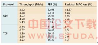 下面我们用另一种方式来评估提高目前ad hoc路由协议的适应性。从这个角度,在MT1和MT3之间放置一个中间节点,因此有两个理想信道而不是第一部分测量中的一个。我们做了10次不同的测试,并且和之前的结果做了比较,它们有着较高的稳定性,UDP的吞吐量固定在3Ms左右,TCP的吞吐量固定在2.5Ms左右,如表2所示。另外,数据包丢失可以忽略不计,而且增强了用户体验,这在基于UDP的应用中是一个至关重要的因素;而在使用TCP协议的情况下,由于在传输层采用了错误和阻塞控制机制,很好地处理了有限的包丢失的情况(通常情况下每次通信不会超过一个段),从而使性能提高了很多。这个方案不仅从性能的角度,而且从能源的角度都是有益的,因为在这种情况下传输器在任何时候都不需要执行MAC重发。这也是比其他传统扩展方案的一个优势所在。