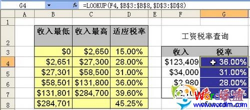 在这个函数中,用第1个收入“$123,409”(F4单元格)当作对比数,用它与左侧表(“$B$3:$D$8”)的第1列数进行对比,虽然“$123,409”在“收入最低”各档数中没有完全一致的数据与之匹配,但是函数的最后一个参数是“TURE”(“TURE”就是模糊查询),所以它会与其中小于它的最大数“$58,501”相匹配。并将表中第3列(函数的第3个参数为“3”)对应的数据提取出来,所以结果同样是“36.00%”。