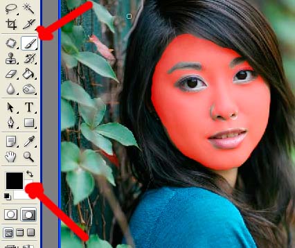 下面我们用它把mm的面部皮肤选出来,点那个钮,选画笔,前景色为黑色,涂你要磨的部分,涂过界的用白色画笔涂回来,来回涂是不是很方便?