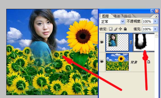 点箭头所指按钮,在MM层出现了一个蒙版图标,而且这个图标是显示被编辑状态,现在的操作就是在蒙版上进行了。我们试着把MM融到花丛里: 首先选黑色画笔,涂抹我们想隐去的部分,是不是和橡皮一样呀?哎呀!涂过界了!不怕,这时咱选白色画笔涂回想露出的部分,这样来回涂,就不用担心过界了。你还可以用软笔头把边缘涂的尽量自然,还可以用低透明度涂出若隐若现的效果。