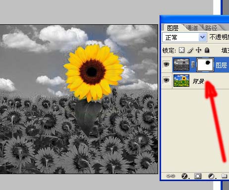 比如局部去色:假如我们想做出只有一朵葵花有颜色的效果。首先复制一层,将复制层去色,添加蒙版,涂出葵花就行了。