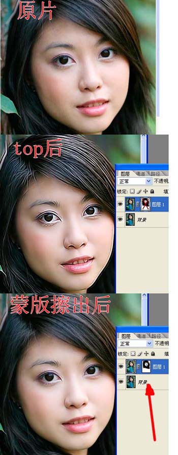 到这里我们是不是体会到了它与橡皮的不同?实际上它与橡皮最大的不同还在于它只是在蒙版上操作,没有对图片造成一点破坏,而橡皮擦过后,图片的像素已经擦掉了。因此,在蒙版上如果做的不满意,我们删掉蒙版就行了,不会对图片有任何影响。