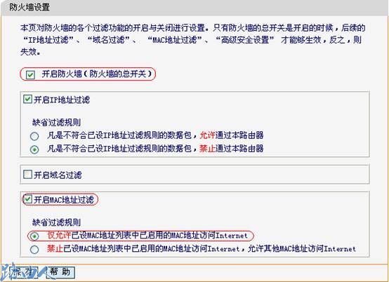 一、选择缺省过滤规则是仅允许已设MAC地址列表中已启用的MAC地址访问Internet