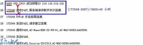 路由器的每条系统日志由一个编号和内容组成,内容的前部数字为路由器开机后运行的时间参数,单位为秒(s),可先后记录接受PADT的时间为X,此日志前面的最相近的显示成功获取IP的日志的时间为Y,(X-Y)/3600即得出多长时间断线。一般情况下看到的现象是24(86400s)或48(172800s)小时会自动断线,然后自动拨号,下图的用户分别在86400,172800,这种情况是由于ISP会在一个帐号认证了24或48小时后获取的动态IP的地址租期达到了设定的时间,因此会收回原有IP资源,再重新分配的过程,属于正常的行为,使用路由器的情况下只要设置连接模式为自动连接即可。
