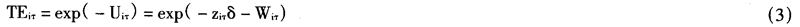 随机变量Wiτ服从截尾正态分布N(0,σ2u),截尾点为-ziτδ。i企业在时期τ的生产技术效率可界定为: