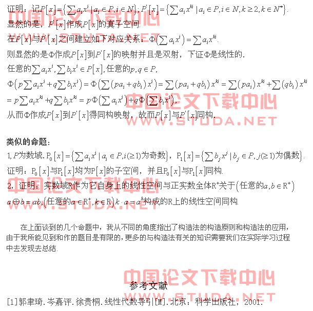 在高等代数的学习过程中,我们常常会遇到一些存在性或者潜在的存在性的定理或者命题的证明,而这类问题的证明往往是很困难的.我们需要考察一个辅助命题,通过这个辅助命题打通原命题的关节,这种证明的方法即是构造法.由于运用构造法时需要引进一个适当的辅助命题,而这个命题并不是那么容易就能够引进的,因此上,构造法要比一般的证明方法困难得多,但它在高等代数中却有着广泛的应用,特别是在证明一些难题时更具价值.本文试图通过几个命题讨论一下构造的原则与构造法的应用.