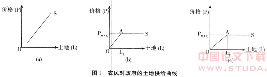 对于农民来说,其供给是不完全受市场价格限制的,所以其土地的供给曲线与市场条件下的供给曲线是不相同的。此时的供给曲线是地权在政府控制下农民的供给曲线。正常的市场供给曲线是由价格决定的,如图1(a)所示。由于地权的主体是政府,所以就出现了垄断的局面,政府对土地的最高征用价格(假定其价格是合乎市场规律的)做了限定。所以如图1(b)所示,最高征用价格 PMAX下,供给曲线于点A处折弯,成为一条直线,即价格的增长不再对土地的供给起作用。直线部分的供给是农民完全被动的供给,其存在是由于此价格是农民必须“出售”的价格。在最高征用价格之下,如图1(b)所示,供给曲线的斜线部分是完全按照市场规律在起作用,但即使在这一部分,同样由于地权不在农民手中,使得农民控制地价的能力大打折扣,相反政府控制能力远远强于农民。这就使得曲线的这一部分发生如图1(c)中的变化,由于没有最低限价,因而O点并不发生变化,而OA部分却比(b)中要平缓得多了,土地的供给弹性变得非常大,直至价格为PMAX。也就是说,政府可能用较小的价格变动获得较多的农民土地。所以在市场价格下,我们在不考虑土地稀缺性得到的农民对政府的土地供给的曲线应该是图1(c)所示的那样。