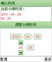 3、进入调整时间页面,请用手机左右键切换年、月、日、小时、分钟,用上下键调整时间,调整时间与服务器时间一致后,请点击保存,如下图: